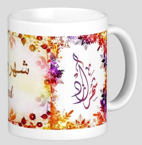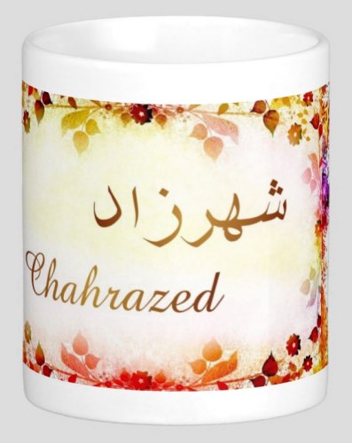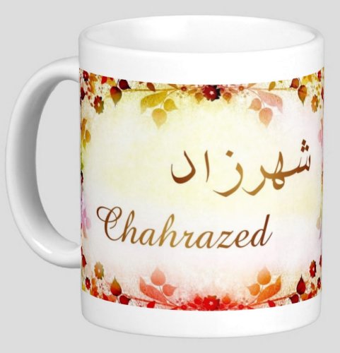 Mug avec le prénom "Chahrazed" écrit en français, en arabe (شهرزاد) et calligraphié de façon artistique en arabe sur la partie droite.