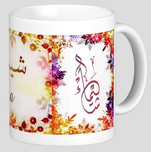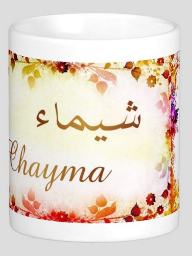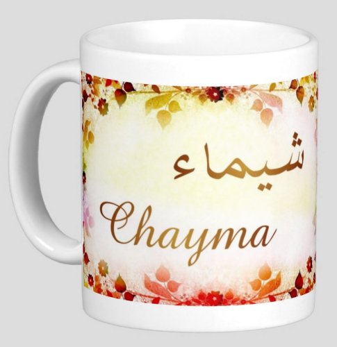 Mug avec le prénom "Chayma" écrit en français, en arabe (شيماء) et calligraphié de façon artistique en arabe sur la partie droite.