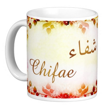 Mug avec le prénom "Chifae" façon artistique en arabe sur la partie droite.