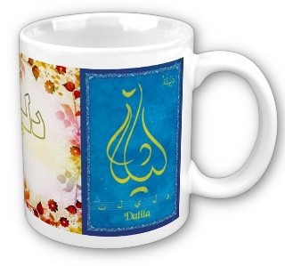 Tasses (mugs) en céramiques avec inscriptions calligraphiques artistiques arabes de prénoms musulmans féminins. Œuvre unique... Idée originale de cadeau !