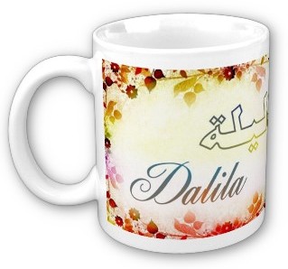 Mug avec le prénom Dalila calligraphié en arabe (دليلة) ainsi que son épellation lettre par lettre en arabe.