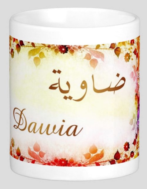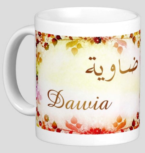 Mug avec le prénom "Dawia" écrit en français, en arabe (ضاوية) et calligraphié de façon artistique en arabe sur la partie droite.