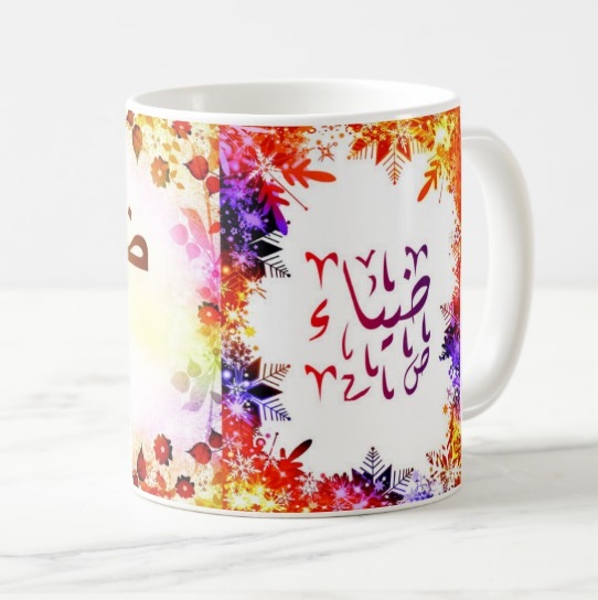 Mug avec le prénom Dhia calligraphié en arabe ainsi que son écriture normale en arabe (ضياء) et en français.