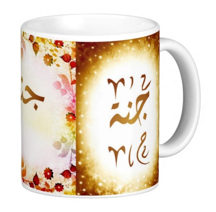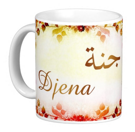 Mug avec le prénom "Djena" écrit en français, en arabe (جنة) et calligraphié de façon artistique en arabe sur la partie droite.