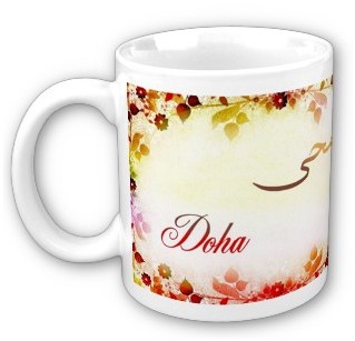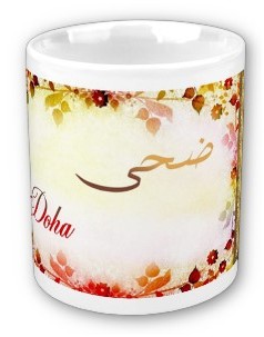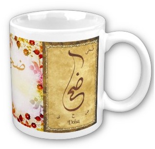 Mug avec le prénom "Doha" calligraphié en arabe (ضحى) ainsi que son épellation lettre par lettre en arabe.
