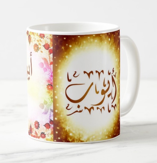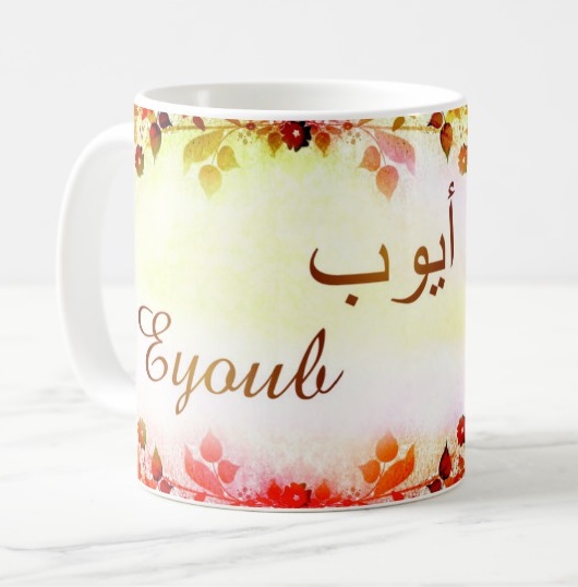 Mug avec le prénom Eyoub calligraphié en arabe ainsi que son écriture normale en arabe (أيوب) et en français.