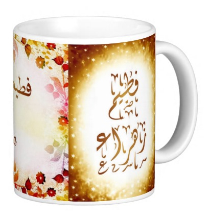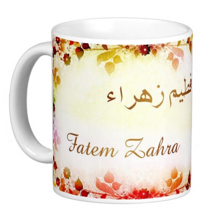 Mug avec le prénom "Fatem Zahra" écrit en français, en arabe (فطيم زهراء) et calligraphié de façon artistique en arabe sur la partie droite.