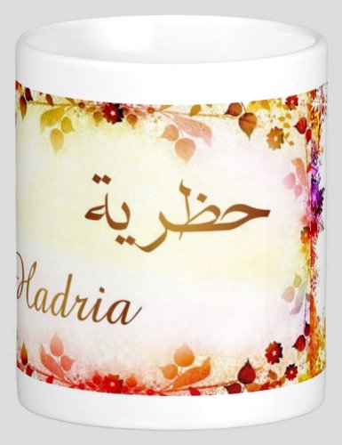 Mug avec le prénom "Hadria" écrit en français, en arabe (حظرية) et calligraphié de façon artistique en arabe sur la partie droite.