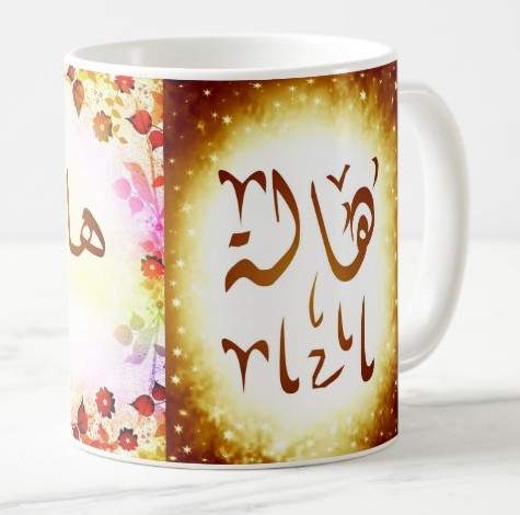 Mug avec le prénom "Hâla" écrit en français, en arabe (هالة) et calligraphié de façon artistique en arabe sur la partie droite.