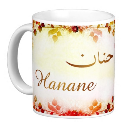 Mug avec le prénom "Hanane" écrit en français, en arabe (حنان) et calligraphié de façon artistique en arabe sur la partie droite.
