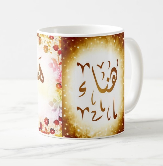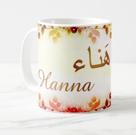 Mug avec le prénom "Hanna" écrit en français, en arabe (هناء) et calligraphié de façon artistique en arabe sur la partie droite.