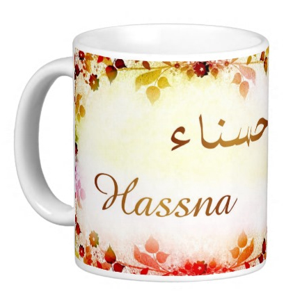 Mug avec le prénom "Hassna" écrit en français, en arabe (حسناء) et calligraphié de façon artistique en arabe sur la partie droite.