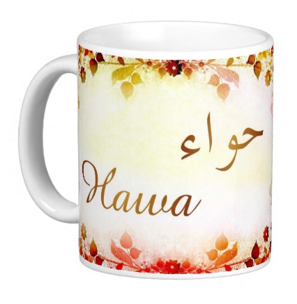 Mug avec le prénom "Hawa" écrit en français, en arabe (حواء) et calligraphié de façon artistique en arabe sur la partie droite.