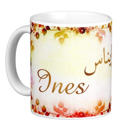 Mug avec le prénom "Ines" écrit en français, en arabe (إيناس) et calligraphié de façon artistique en arabe sur la partie droite.