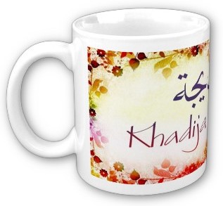 Mug avec le prénom Khadija calligraphié en arabe (خديجة) ainsi que son épellation lettre par lettre en arabe.