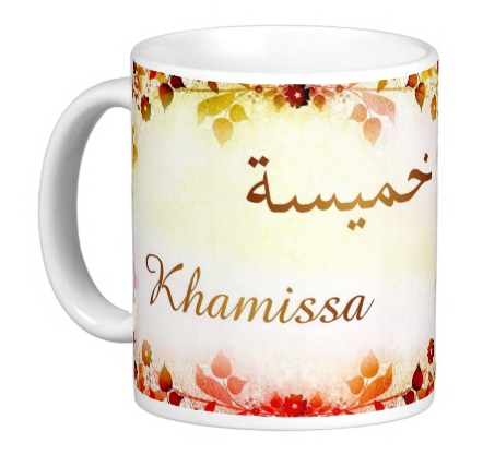 Mug avec le prénom "Khamissa" écrit en français, en arabe (خميسة) et calligraphié de façon artistique en arabe sur la partie droite.