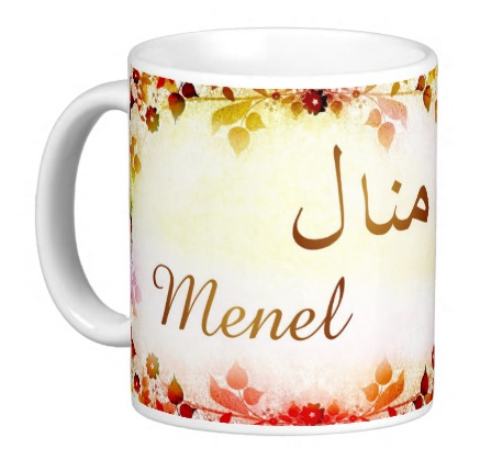 Mug avec le prénom "Menel" écrit en français, en arabe (منال) et calligraphié de façon artistique en arabe sur la partie droite.