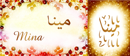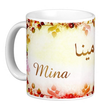 Mug avec le prénom "Mina" écrit en français, en arabe (مينا) et calligraphié de façon artistique en arabe sur la partie droite.
