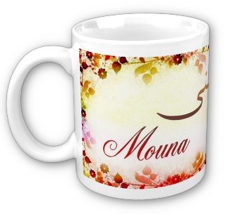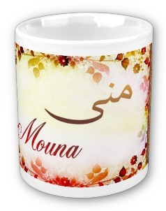 Mug avec le prénom Mouna calligraphié en arabe (منى) ainsi que son épellation lettre par lettre en arabe.