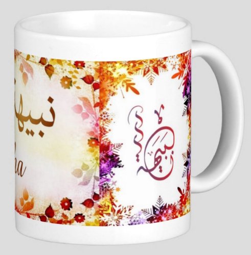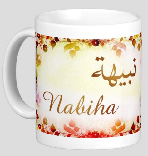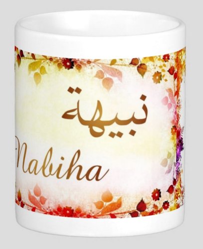 Mug avec le prénom "Nabiha" écrit en français, en arabe (نبيهة) et calligraphié de façon artistique en arabe sur la partie droite.