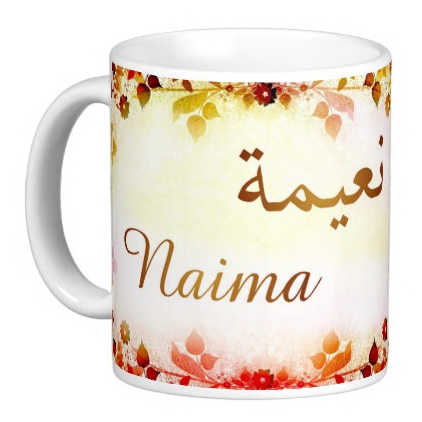 Mug avec le prénom "Naima" écrit en français, en arabe (نعيمة) et calligraphié de façon artistique en arabe sur la partie droite.