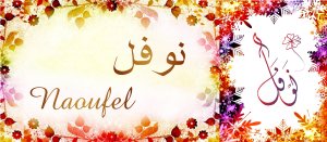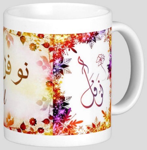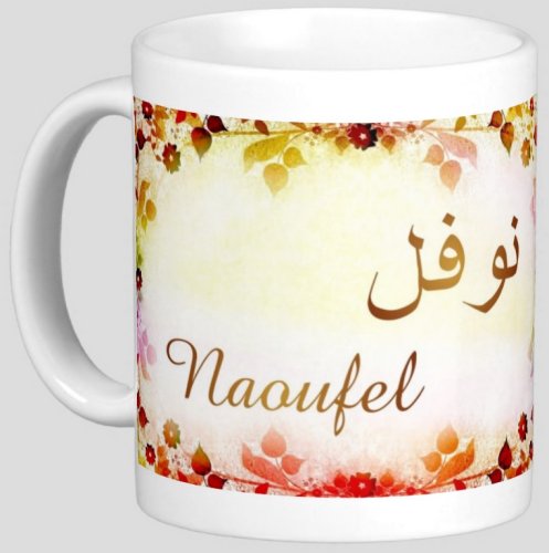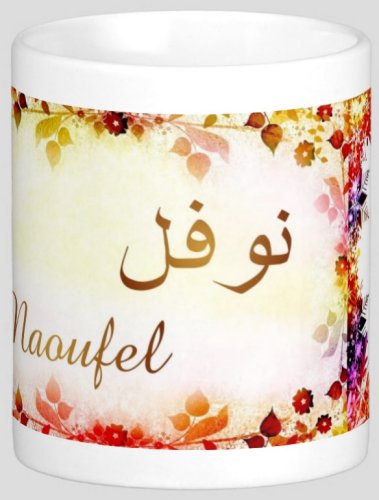 Mug avec le prénom "Naoufel" écrit en français, en arabe (نوفل) et calligraphié de façon artistique en arabe sur la partie droite.