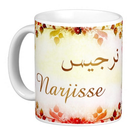 Mug avec le prénom "Narjisse" écrit en français, en arabe (نرجيس) et calligraphié de façon artistique en arabe sur la partie droite.