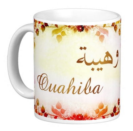 Mug avec le prénom "Ouahiba" écrit en français, en arabe (وهيبة) et calligraphié de façon artistique en arabe sur la partie droite.