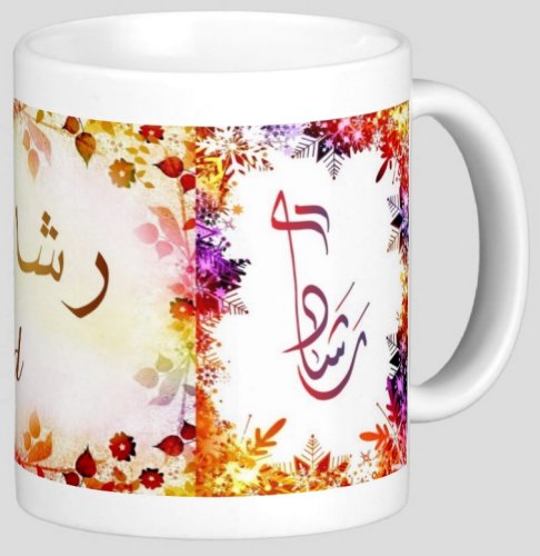 Mug avec le prénom "Rachad" écrit en français, en arabe (رشاد) et calligraphié de façon artistique en arabe sur la partie droite.