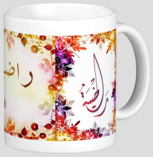 Mug avec le prénom "Radhia" écrit en français, en arabe (راضية) et calligraphié de façon artistique en arabe sur la partie droite.
