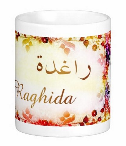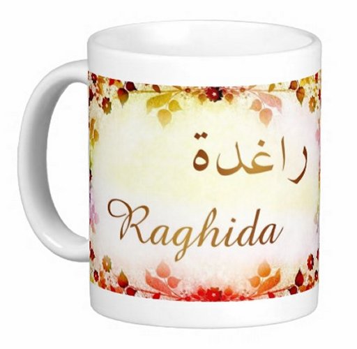 Mug avec le prénom "Raghida" écrit en français, en arabe (راغدة) et calligraphié de façon artistique en arabe sur la partie droite.