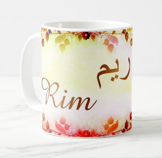 Mug avec le prénom Rim calligraphié en arabe ainsi que son écriture normale en arabe (ريم) et en français.
