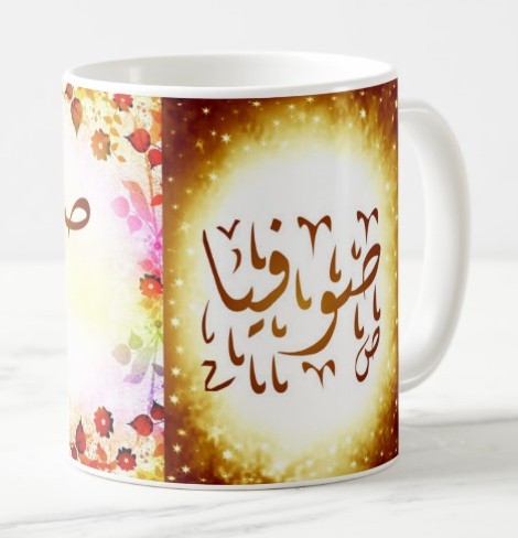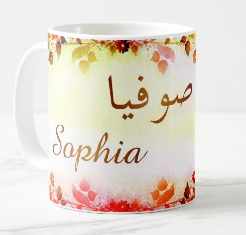 Mug avec le prénom "Sophia" écrit en français, en arabe (صوفيا) et calligraphié de façon artistique en arabe sur la partie droite.