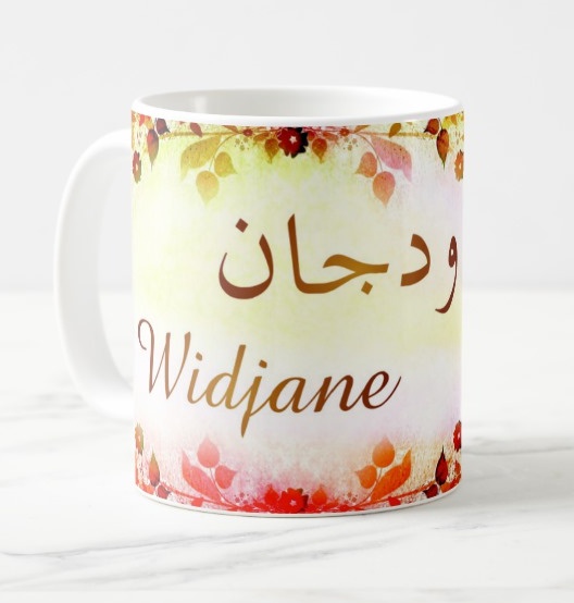 Mug avec le prénom Widjane calligraphié en arabe ainsi que son écriture normale en arabe (ودجان) et en français.
