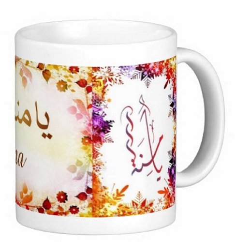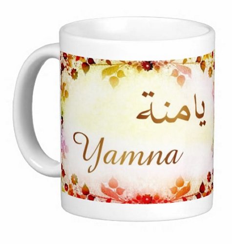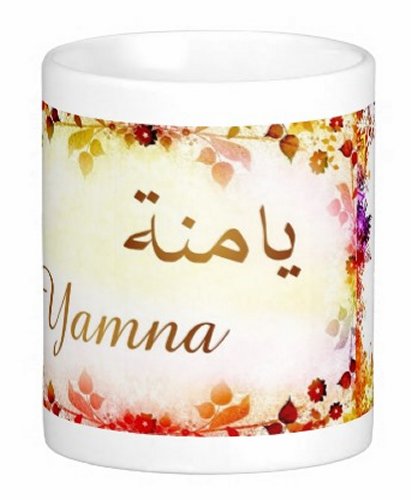 Mug avec le prénom "Yamna" écrit en français, en arabe (يامنة) et calligraphié de façon artistique en arabe sur la partie droite.