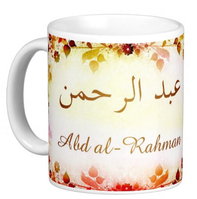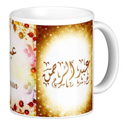 Mug avec le prénom "Abd Al-Rahman" écrit en français, en arabe (عبد الرحمن) et calligraphié de façon artistique en arabe sur la partie droite.