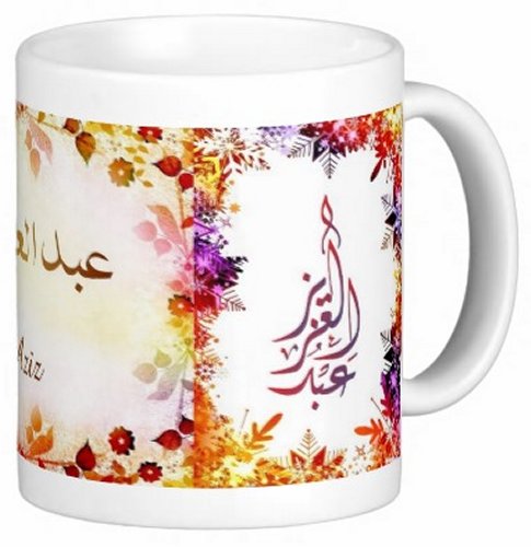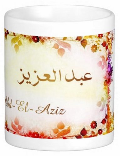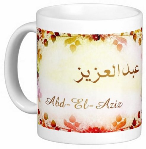 Mug avec le prénom "Abd-El-Aziz" écrit en français, en arabe (عبد العزيز) et calligraphié de façon artistique en arabe sur la partie droite.