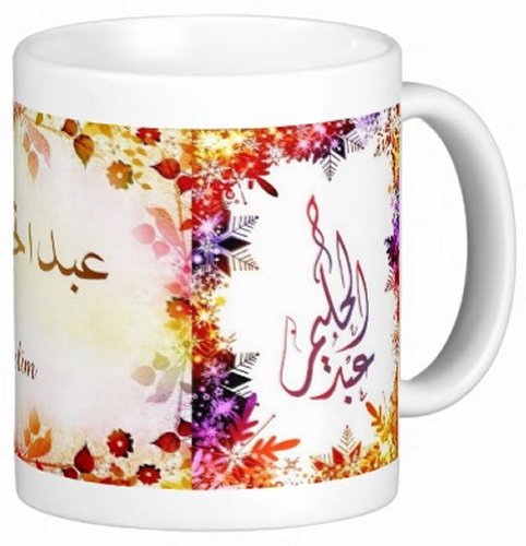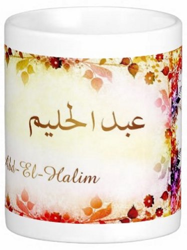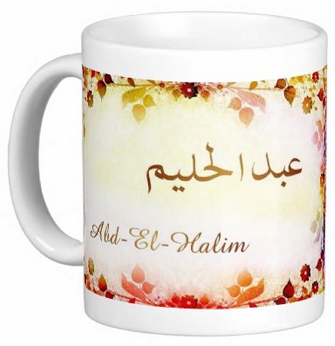 Mug avec le prénom "Abd-El-Halim" écrit en français, en arabe (عبد الحليم) et calligraphié de façon artistique en arabe sur la partie droite.