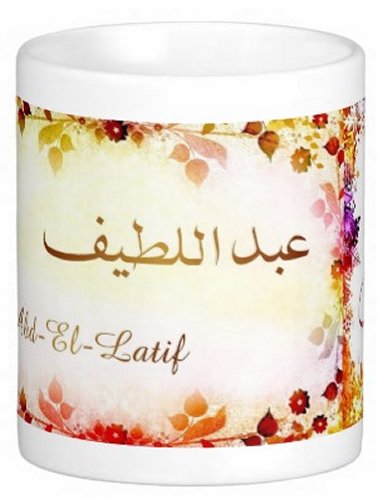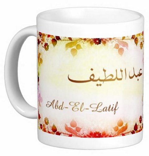 Mug avec le prénom "Abd-El-Latif" écrit en français, en arabe (عبد اللطيف) et calligraphié de façon artistique en arabe sur la partie droite.