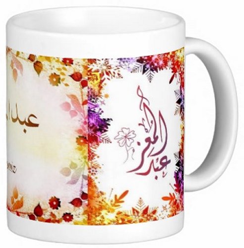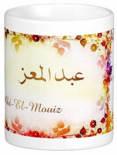 Mug avec le prénom "Abd-El-Mouiz" écrit en français, en arabe (عبد المعز) et calligraphié de façon artistique en arabe sur la partie droite.