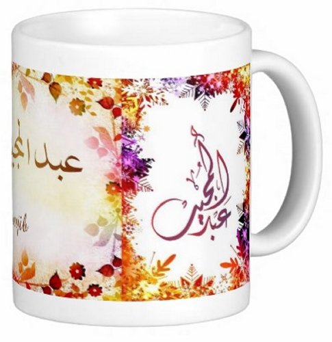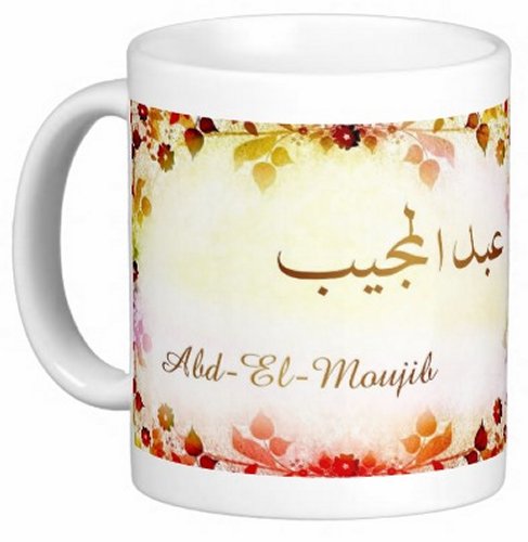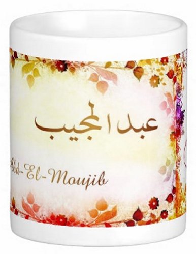 Mug avec le prénom "Abd-El-Moujib" écrit en français, en arabe (عبد المجيب) et calligraphié de façon artistique en arabe sur la partie droite.