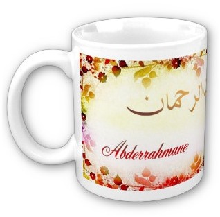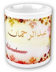 Mug avec le prénom "Abderrahmane" calligraphié en arabe (عبدالرحمن) ainsi que son épellation lettre par lettre en arabe.