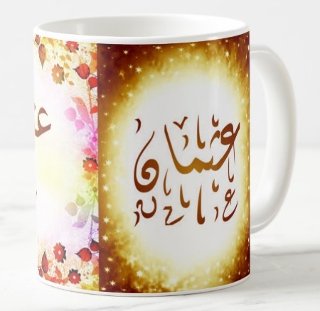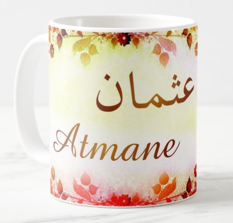 Mug avec le prénom "Atmane" écrit en français, en arabe(عثمان) et calligraphié de façon artistique en arabe sur la partie droite.