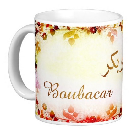 Mug avec le prénom "Boubacar" écrit en français, en arabe (بوبكر) et calligraphié de façon artistique en arabe sur la partie droite.