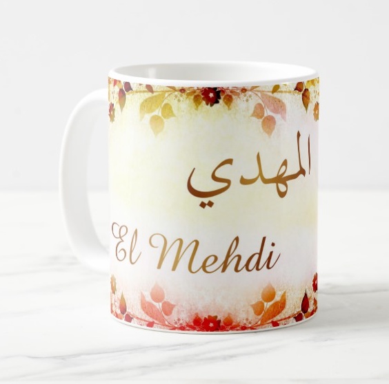 Mug avec le prénom "El Mehdi" écrit en français, en arabe (المهدي) et calligraphié de façon artistique en arabe sur la partie droite.