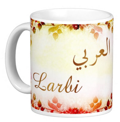 Mug avec le prénom "Larbi" écrit en français, en arabe (العربي) et calligraphié de façon artistique en arabe sur la partie droite.