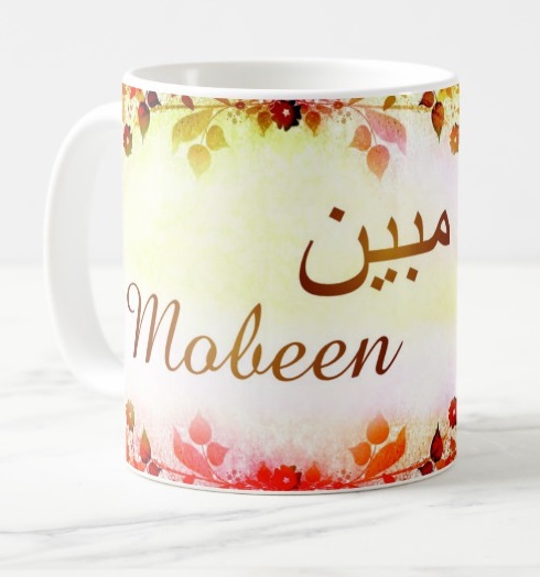 Mug avec le prénom Mobeen calligraphié en arabe ainsi que son écriture normale en arabe (مبين) et en français.