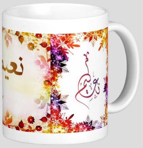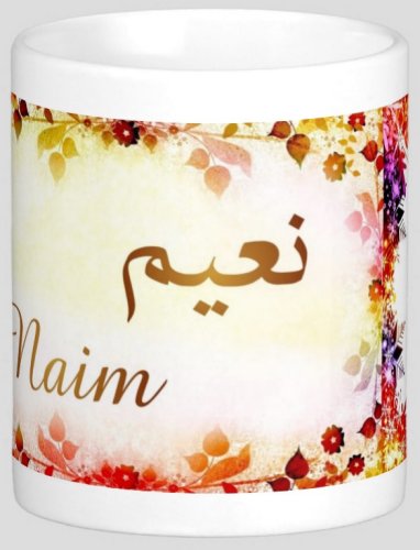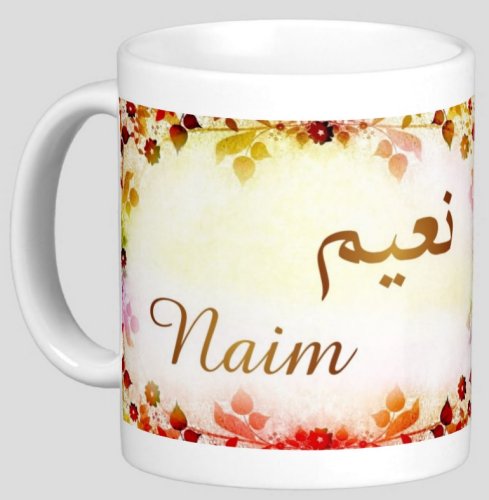 Mug avec le prénom "Naim" écrit en français, en arabe (نعيم) et calligraphié de façon artistique en arabe sur la partie droite.