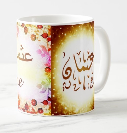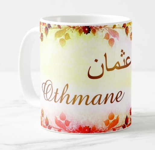 Mug avec le prénom "Othmane" écrit en français, en arabe (عثمان) et calligraphié de façon artistique en arabe sur la partie droite.
