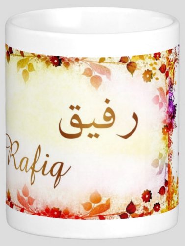 Mug avec le prénom "Rafiq" écrit en français, en arabe (رفيق) et calligraphié de façon artistique en arabe sur la partie droite.